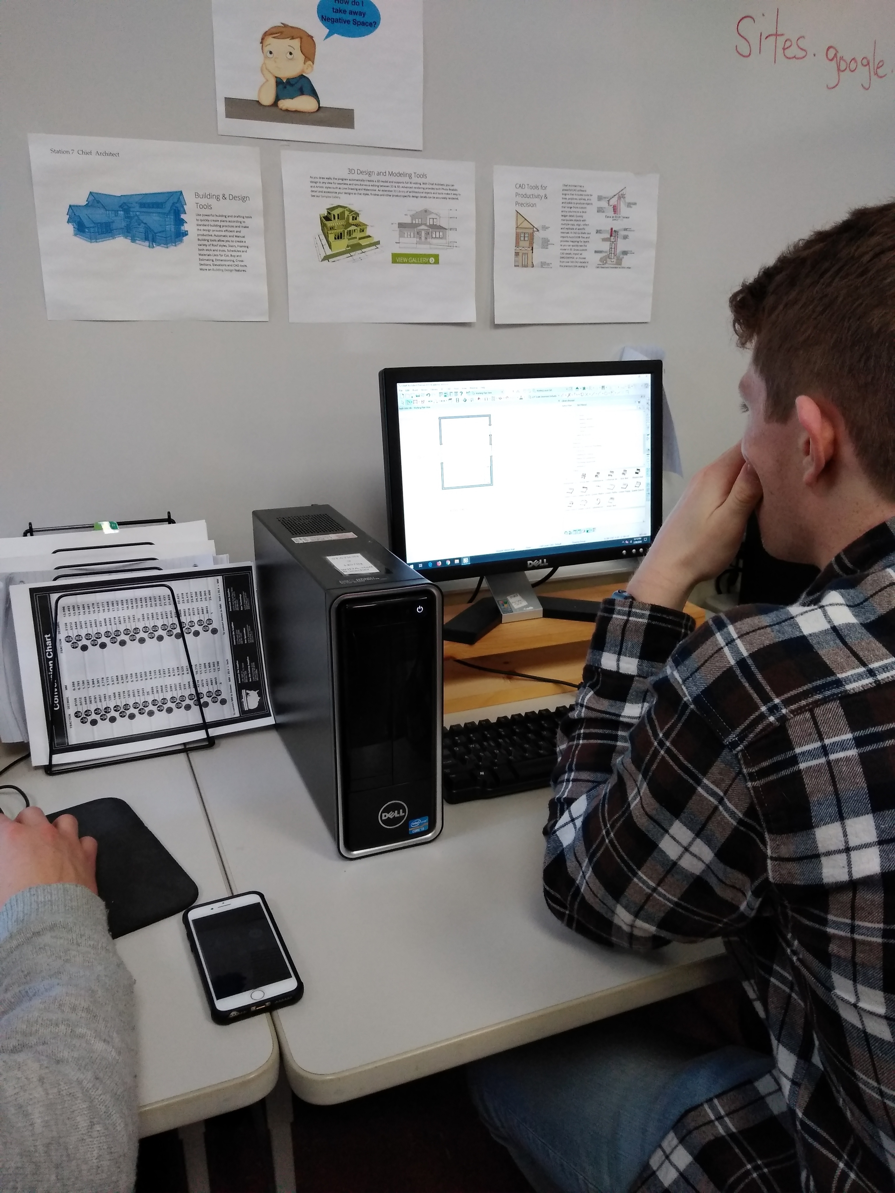 Students in Jeff Stockford's Architect class are designing a house with a foot print of 320 square feet. How do I do 2 sets of stairs? Where can I find the toilet? How do I do a second floor? These are just a few of the questions students are asking each other. Found the plumbing, but where is the toilet? Time to call someone that has used this before. Thanks to Maranacook 2018 graduate Matthew Scott, currently studying to be a precision machinist, students were able to call him and ask questions, by speaker phone they got their questions answered. What a great way to collaborate with others outside of the classroom walls.